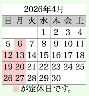 【お店からの大切なお知らせ】4月の休み→6,12,13,19,20,26,275月の休み→4,10,11,17,18,24,25,26,31